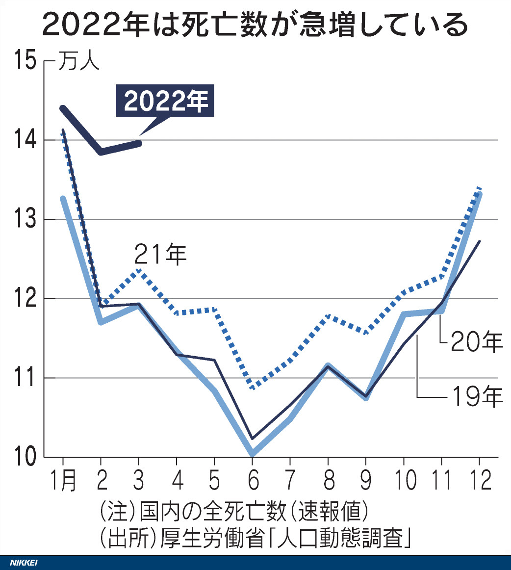 老衰は高齢化でもともと増加傾向にある。一方、循環器系の疾患は20年は前年より約5千人減っていたが、21年は増加に転じた。同省の担当者は「増加の要因は分析できていない。コロナ禍前から進む高齢化による増加が続いているのではないか」とみている。」
